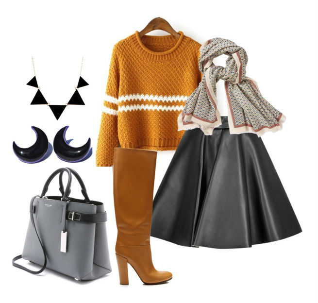 Для офисного аутфита пригодится такая идея: коричневая юбка и колготки, черные ботильоны, светлая рубашка и серый тренч. На прогулку с подругами можно отправиться в желтовато-коричневых сапогах на каблуке, горчичном свитере с белыми полосами и черной юбке-клеш. В качестве аксессуаров подойдет серая сумка и шарф. Светлая блуза, серые лосины с шарфом, а также коричневая кожаная куртка и ботинки на шнуровке — выбор поклонников кэжуала.