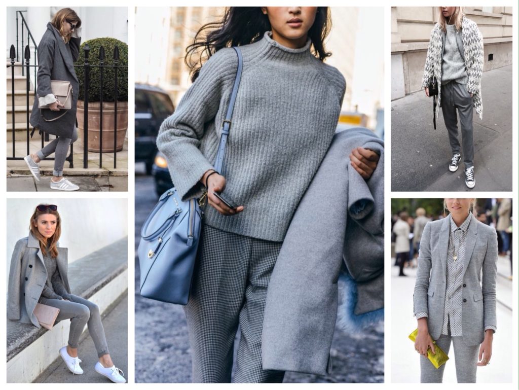 Несмотря на то, что серый относится к ахроматическим оттенкам, тотал лук не смотрится скучно и однообразно. Наоборот, аутфит в сером цвете приковывает взгляды и выглядит стильно. С серым хорошо составлять образы в стиле спорт-шик. Как вариант, наденьте укороченные брюки, свитшот, пальто, шарф и дополните все белыми кроссовками.